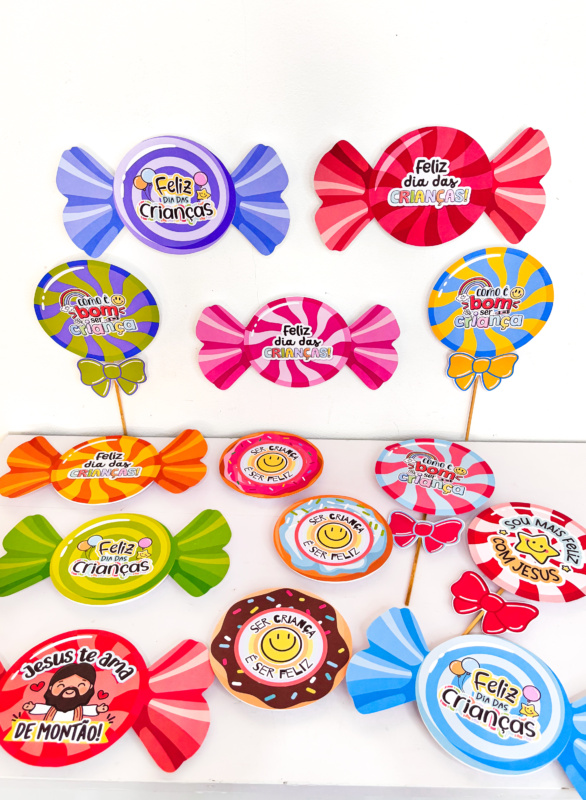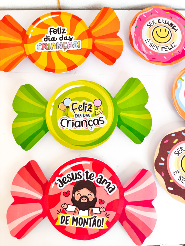 🎁 São lembrancinhas fofas e cheias de sabor em 3 versões encantadoras: pirulito, bala e donuts, com 14 variações coloridas 🍭🍬🍩.