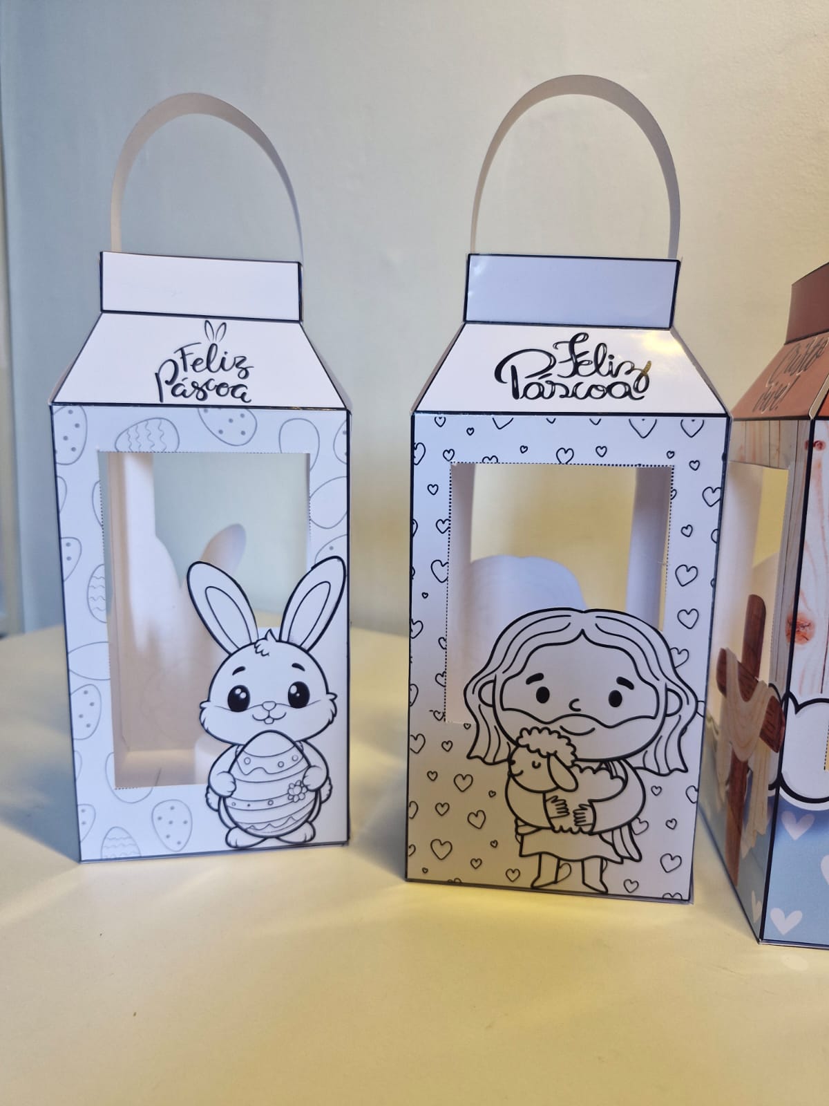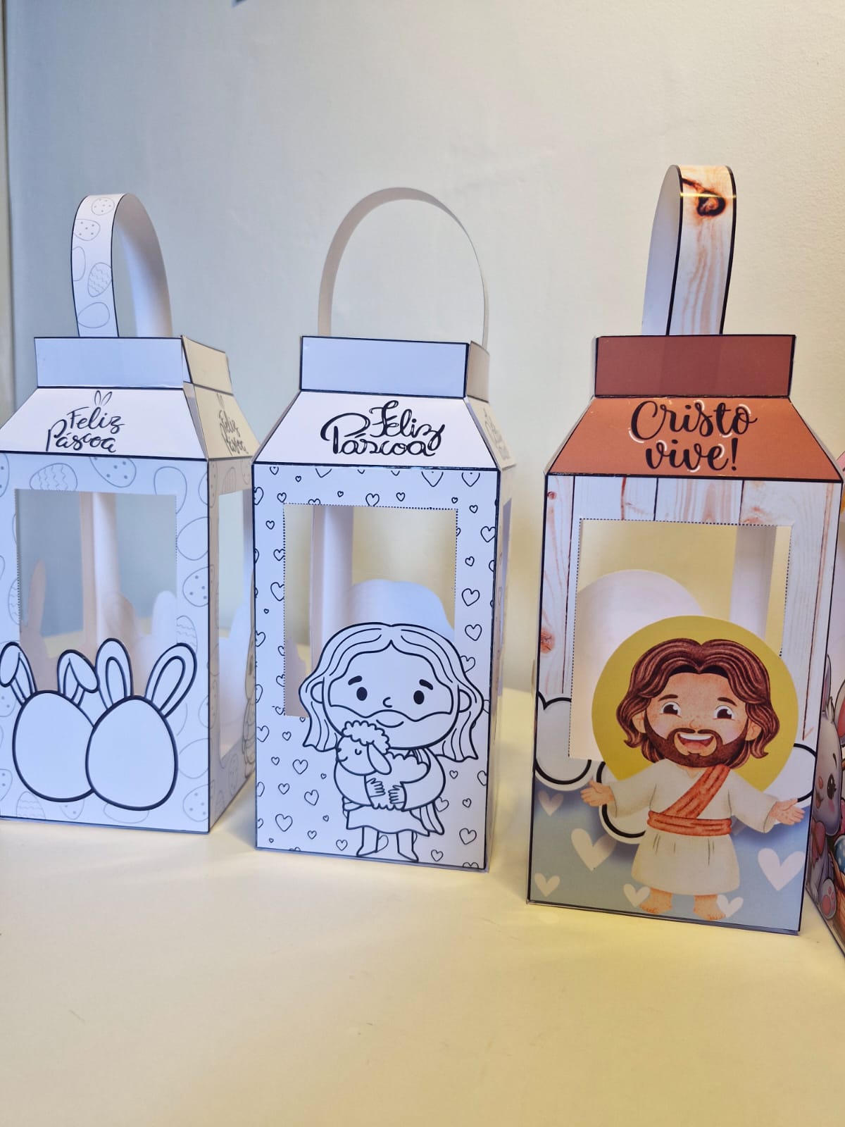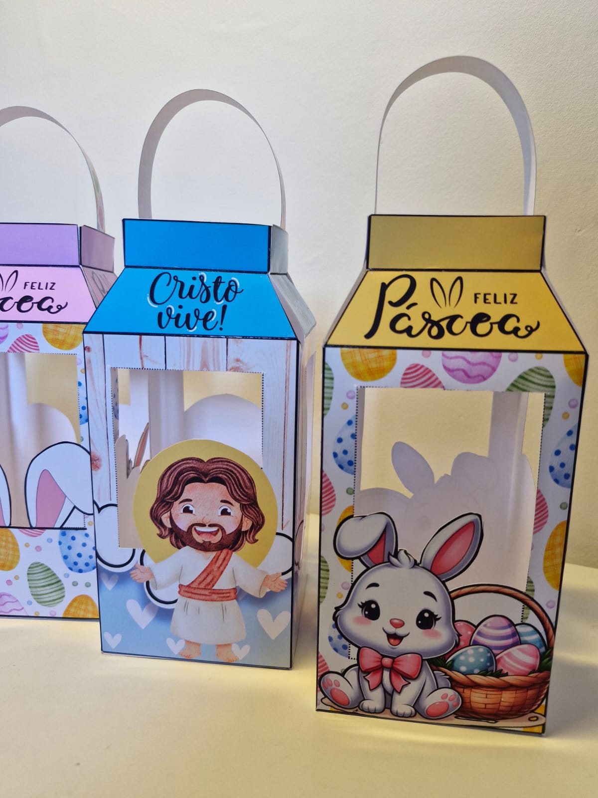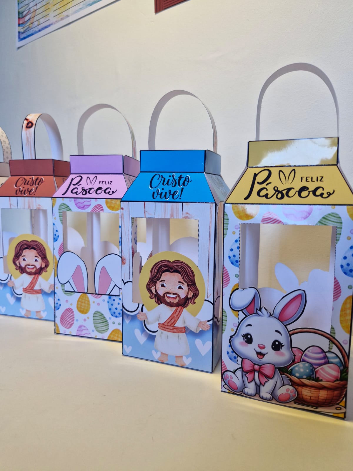 4 modelos coloridos (2 com tema de coelhinhos e 2 com temática da Páscoa Cristã)