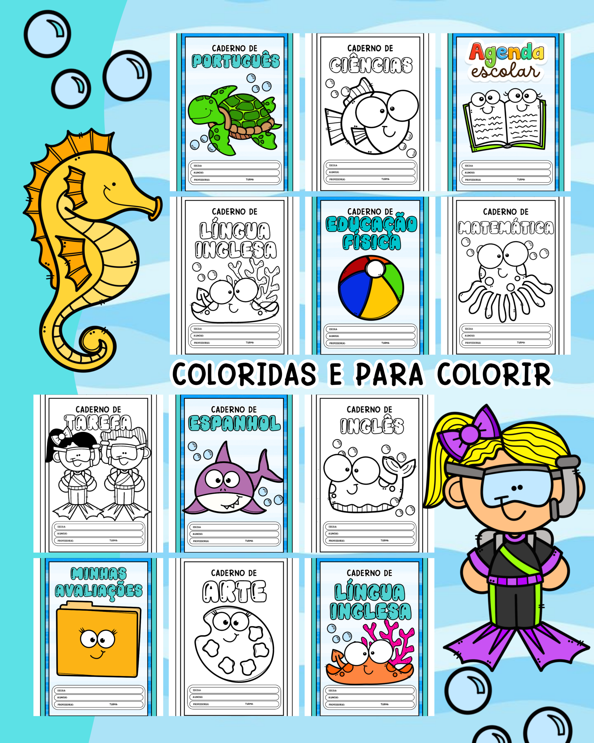 🗂️ O kit conta com 18 modelos, atendendo as principais disciplinas e usos escolares: