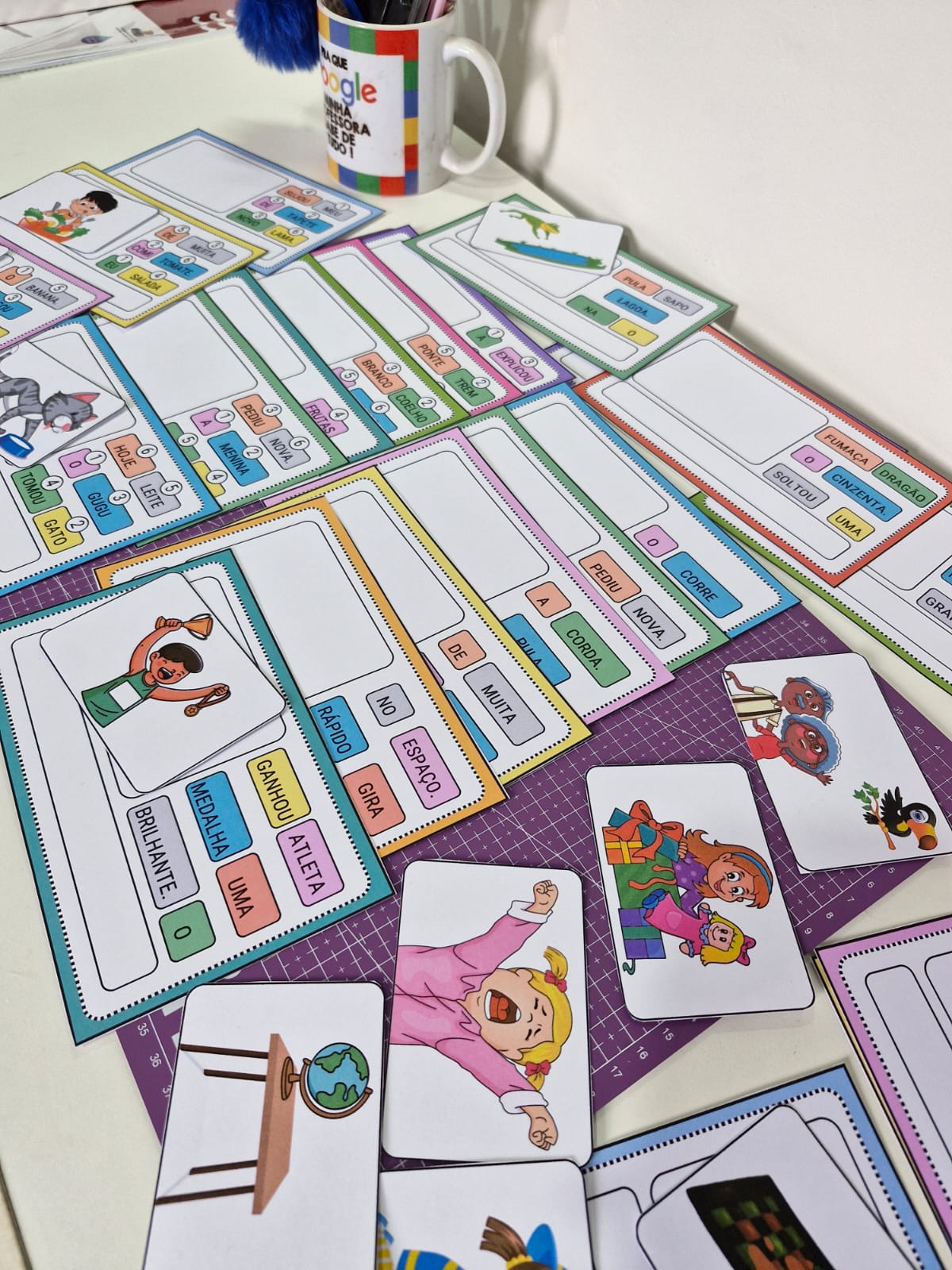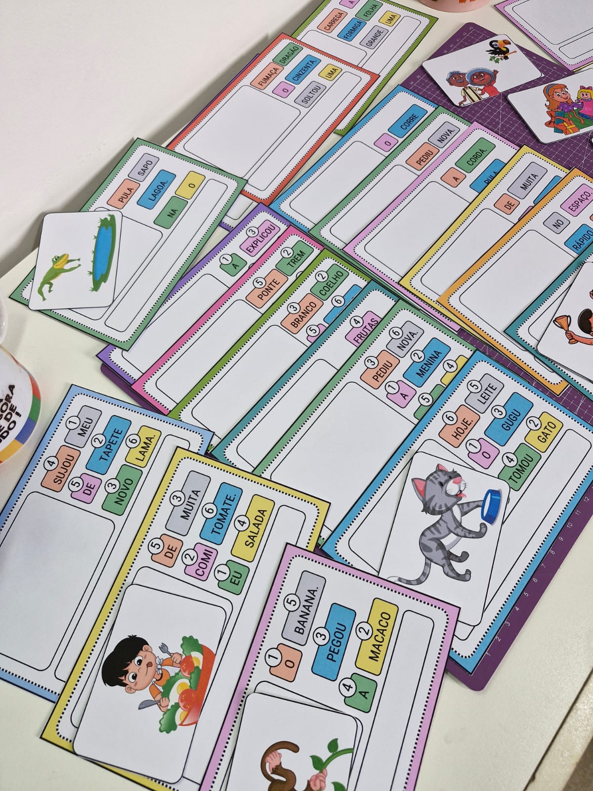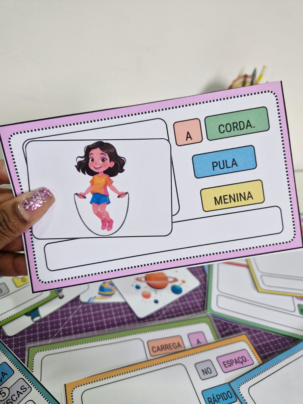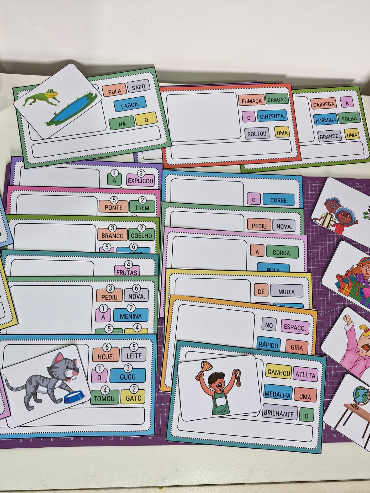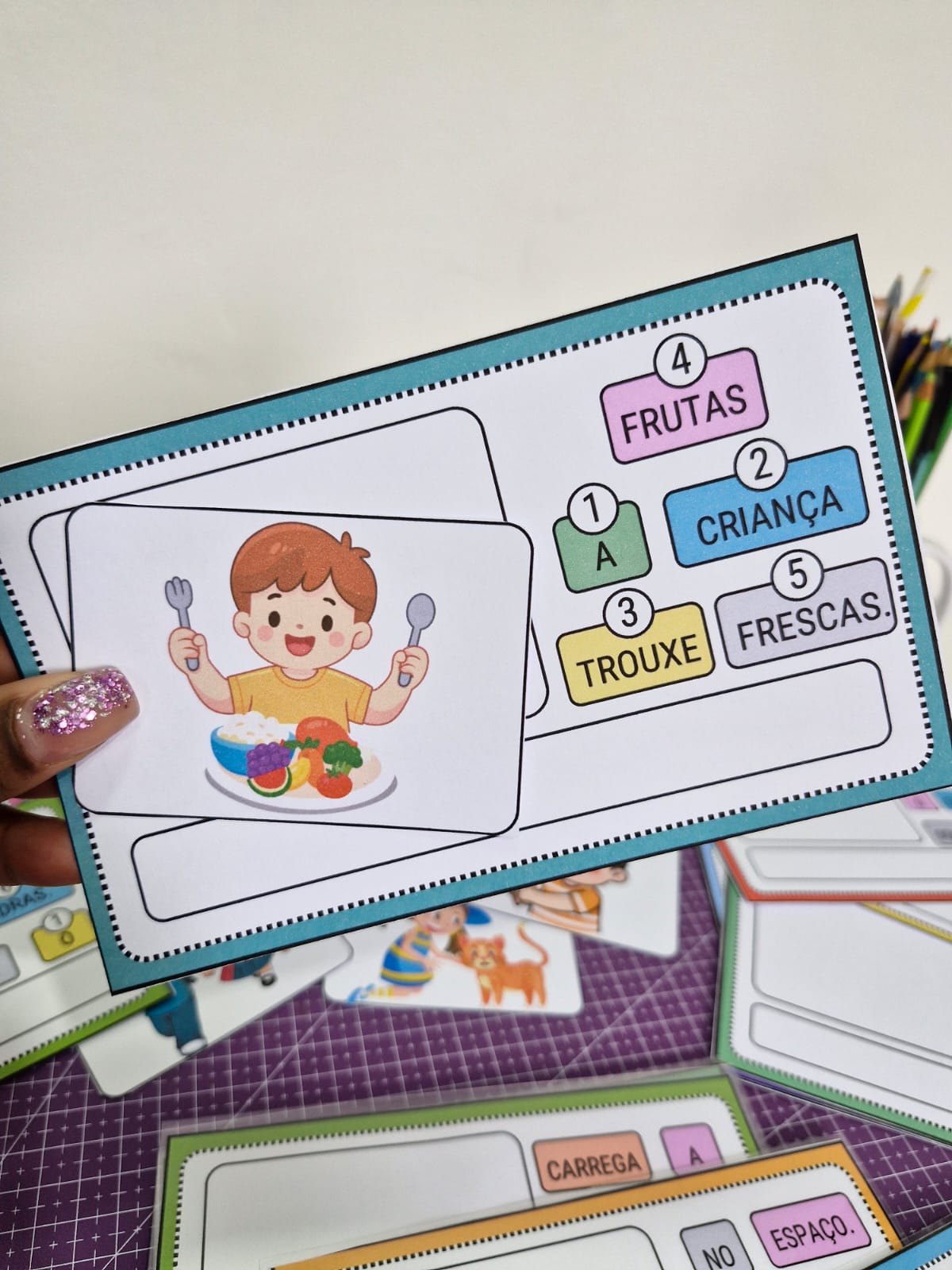 Cada ficha acompanha uma ilustração correspondente, incentivando o aluno a identificar a imagem correta e organizar a frase com sentido.