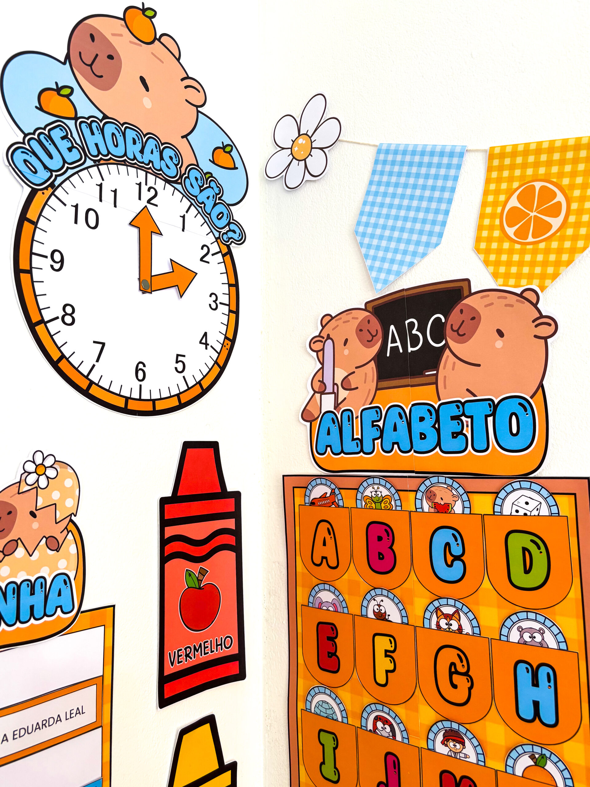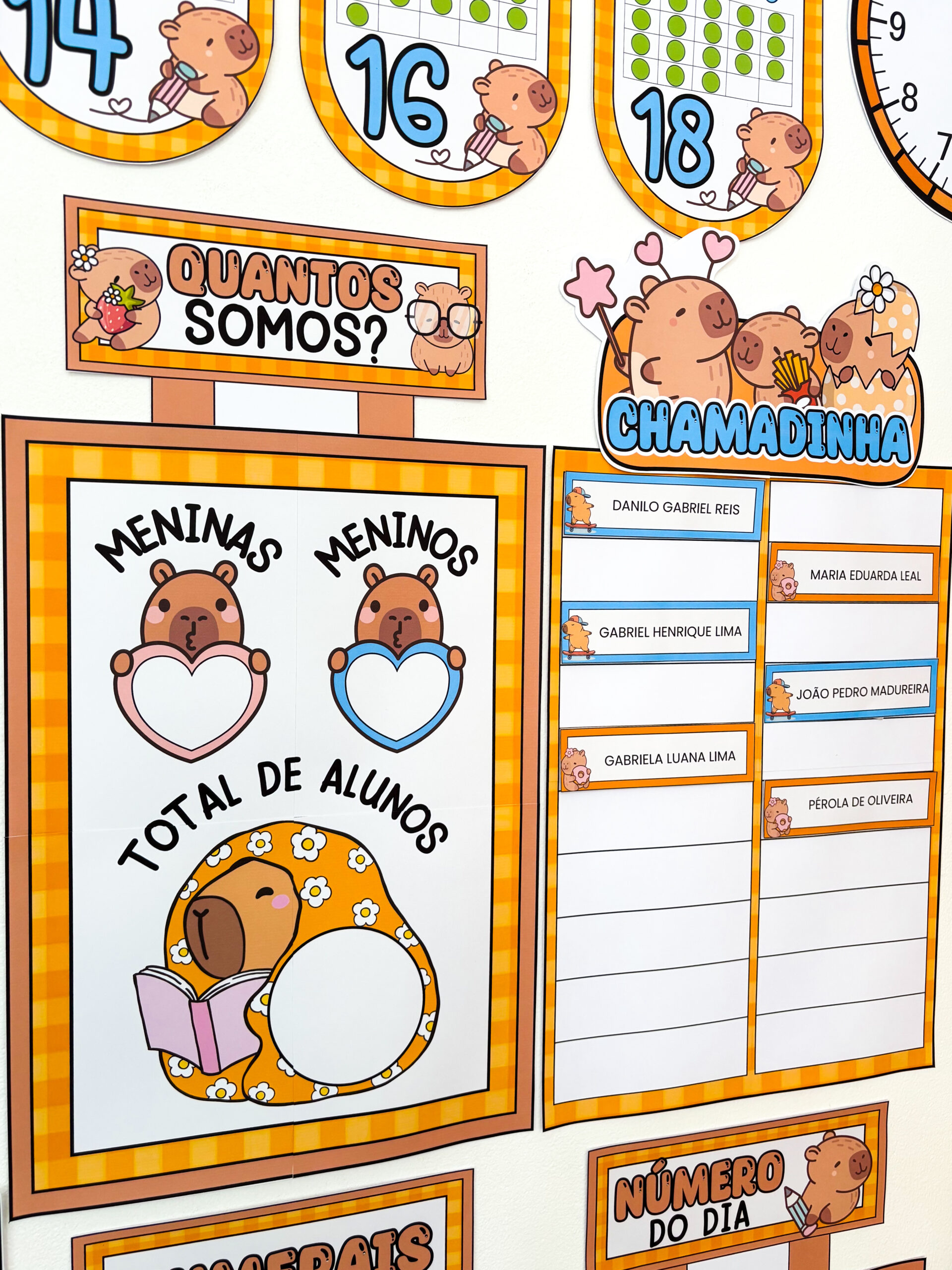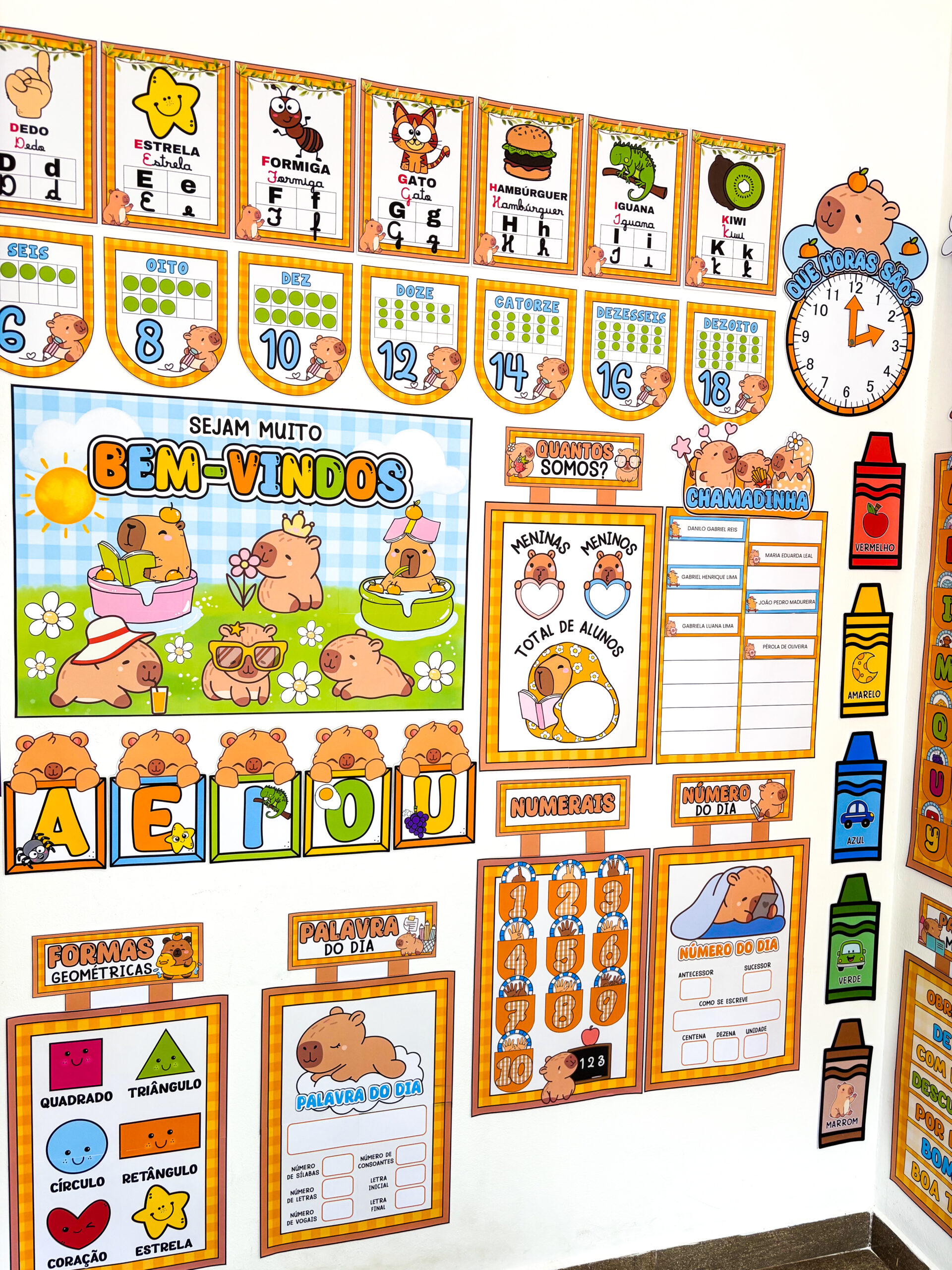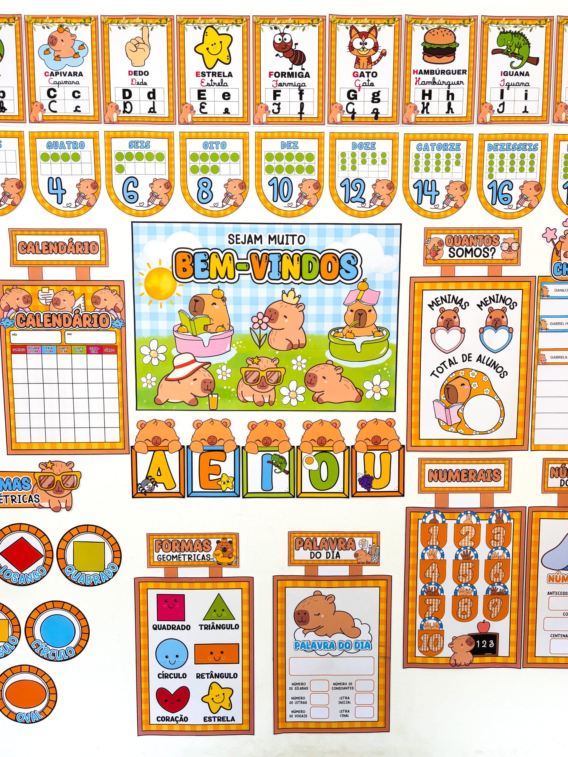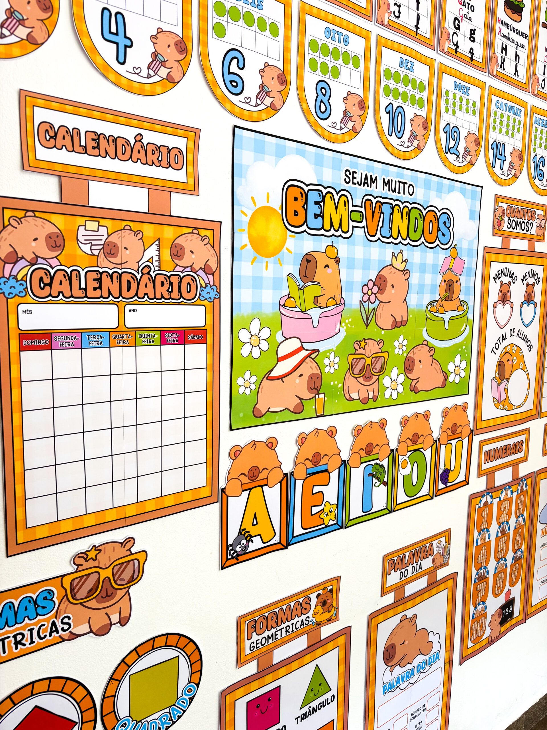 Apresento o Kit de Ornamentação – Tema Capivara, criado para deixar o ambiente acolhedor, organizado e pedagogicamente poderoso — daquele jeito que as crianças entram e já dizem: “Uau, que sala linda!” 😍