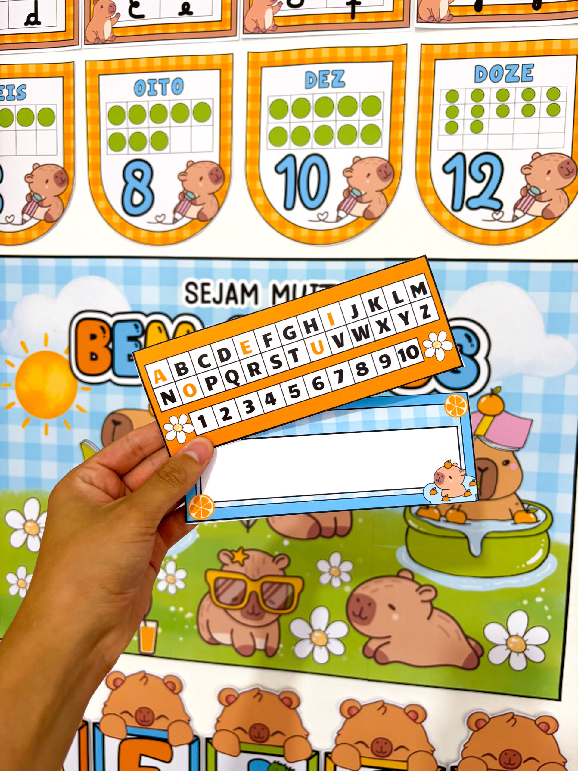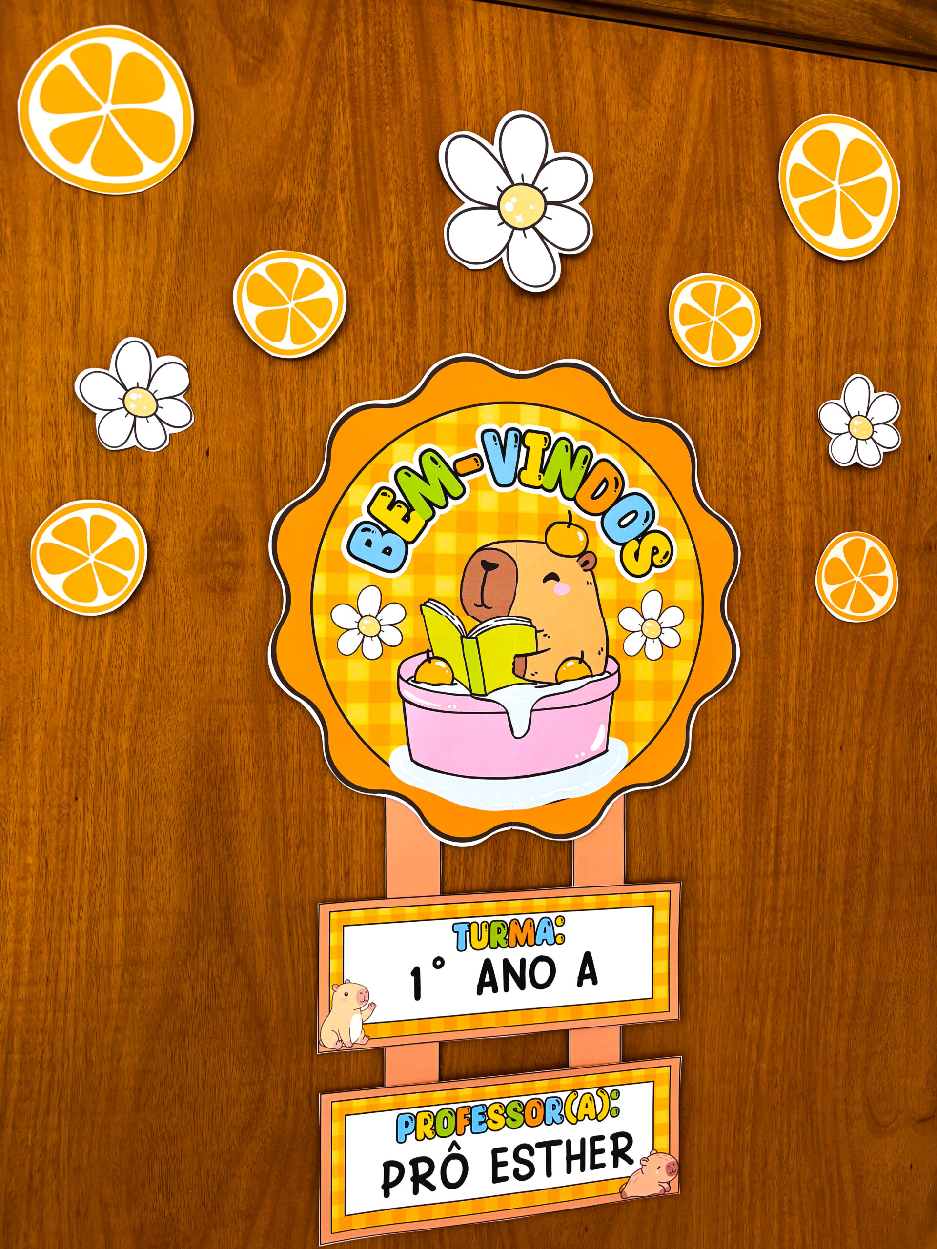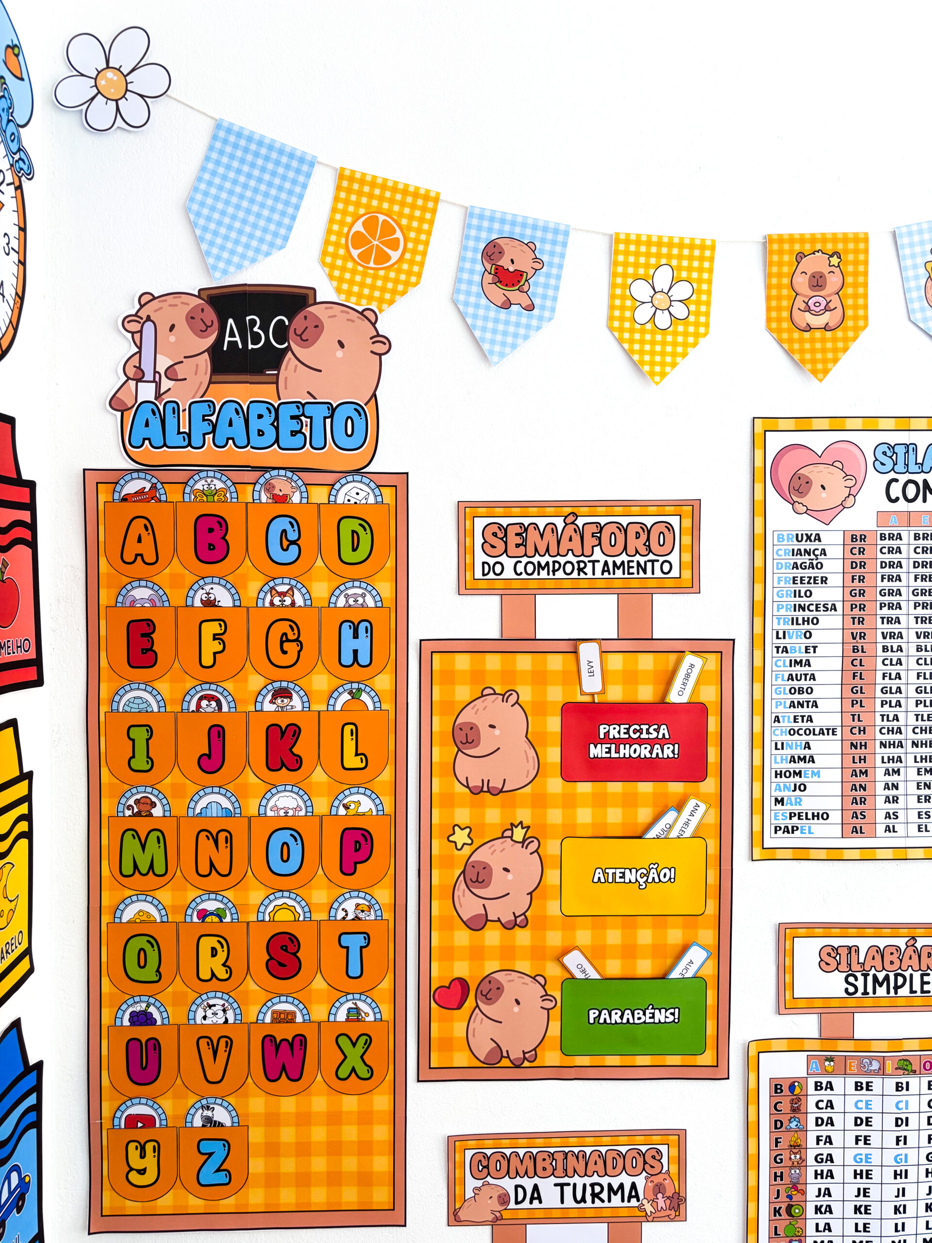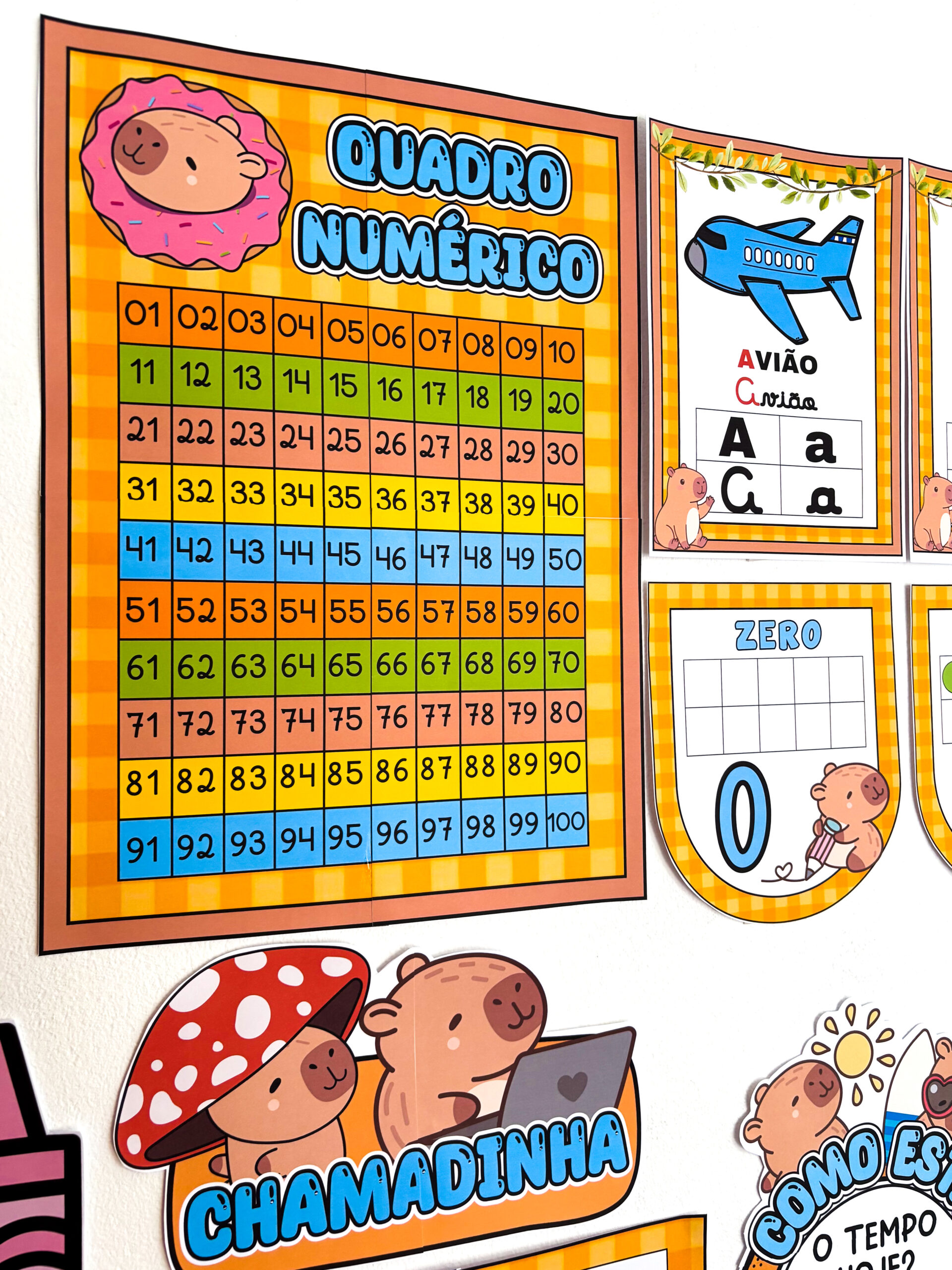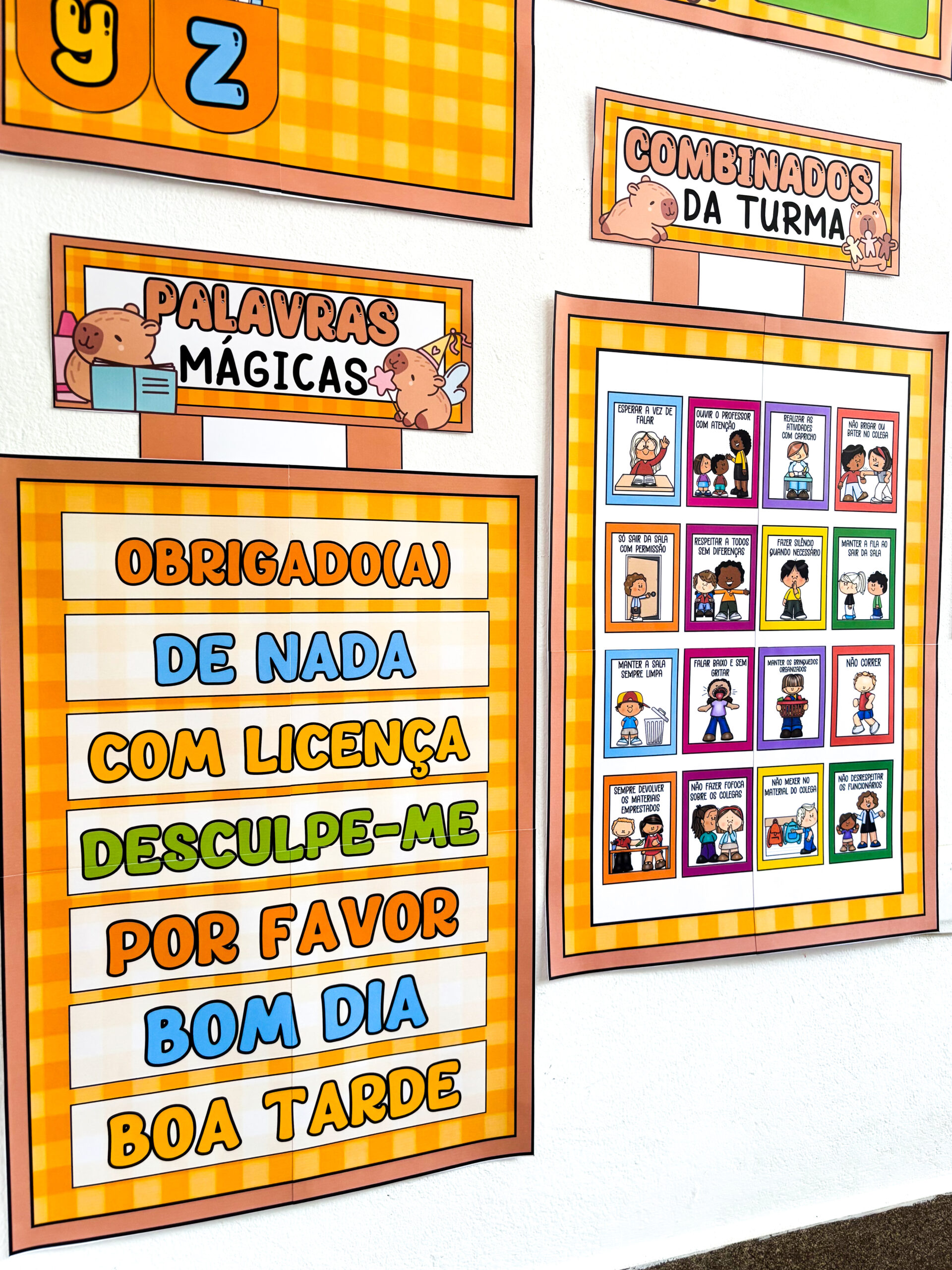 Apresento o Kit de Ornamentação – Tema Capivara, criado para deixar o ambiente acolhedor, organizado e pedagogicamente poderoso — daquele jeito que as crianças entram e já dizem: “Uau, que sala linda!” 😍